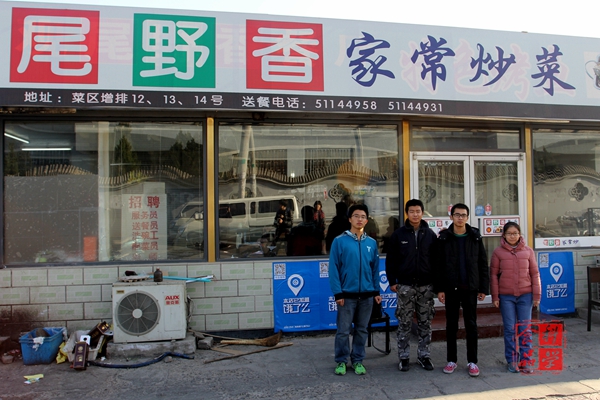 餐馆是由学院2009级毕业生卢亚光和王浩楠合办,戴着黑框眼镜,留着寸头的他们,眼神中显示着英气,年轻的脸庞上透露着对于未来的向往,以及年轻人难得的沉稳。尾野香餐馆坐落于北农学校后门,沿街营业,如果不是有人指引,我绝对不会知道这是一家由北农大学生自己开的店,也不会知道在这家店里发生的一个有关青春与梦想的故事。