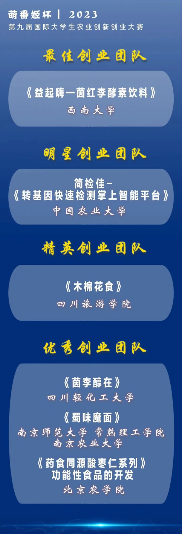 2023年1月15日,第九届“萌番姬杯”国际大学生农业创新创业大赛决赛在北京中红乡村振兴文化创业园成功举办。开云手机站登录入口副院长丁轲和文法与城乡发展学院教师毛洋共同指导开云手机站登录入口研究生王荟文、杨帆、王迎秋和邹源鑫,本科生龚正龙和刘可欣,以«药食同源酸枣仁系列功能性食品的开发»项目参赛,经过层层选拔,从331个项目中脱颖而出,荣获优秀创业团队奖。