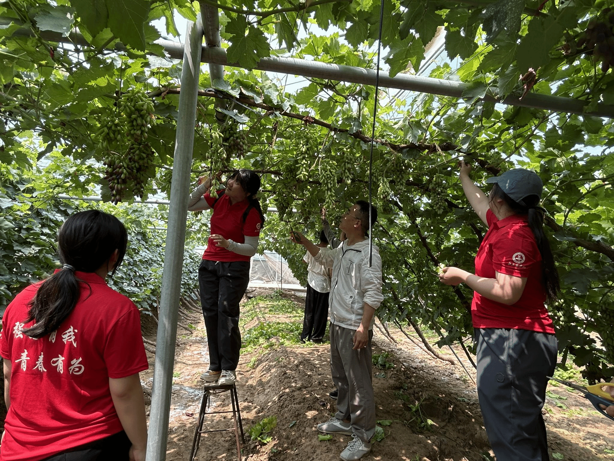 在魏晓峰的示范指导下,实践团成员帮助当地农民对葡萄园的行间土壤进行了清理和平整,对葡萄树体的副梢进行了修剪和绑缚,对病枯叶片进行了清除。
