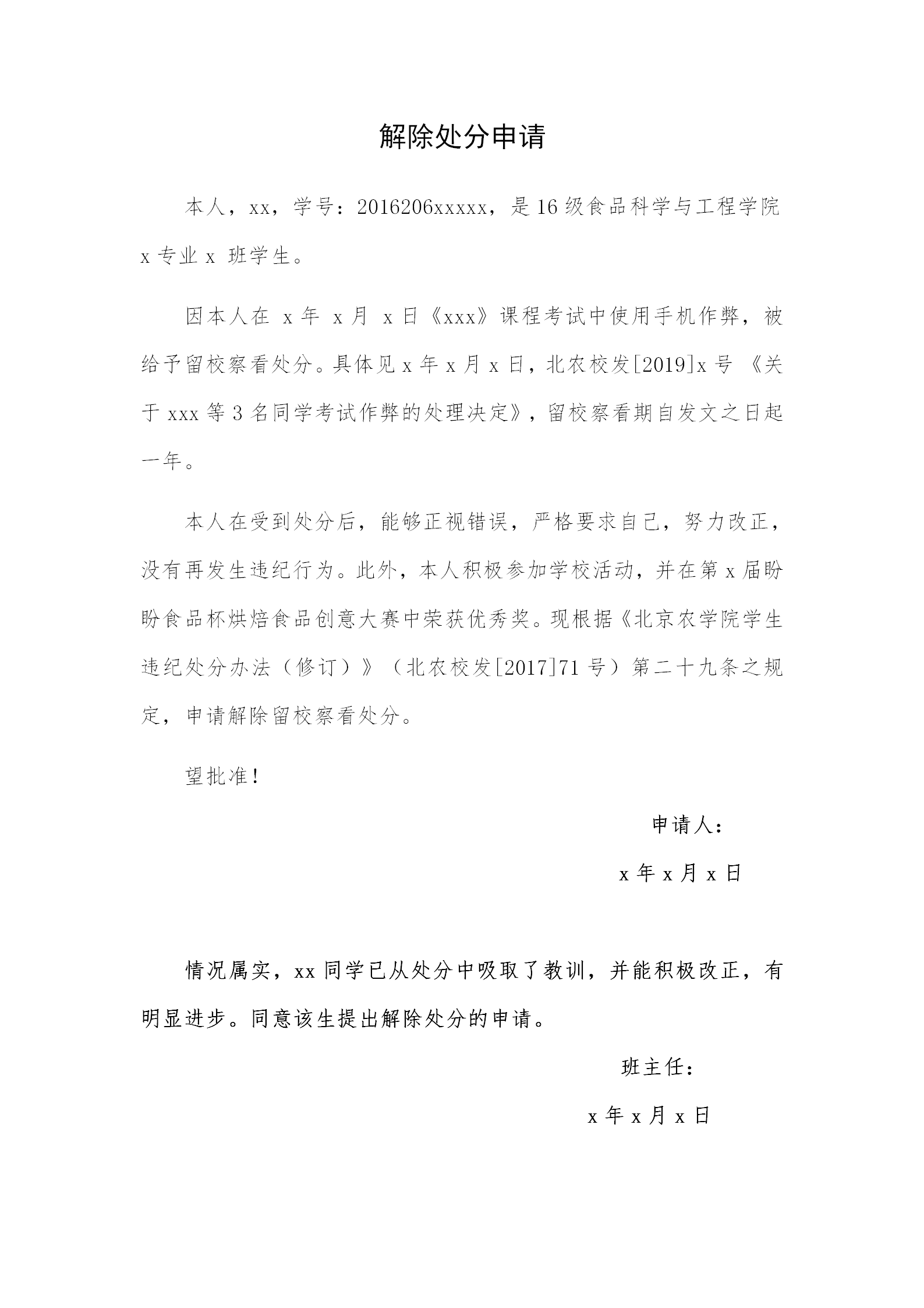 按北京农学院要求,每年5月和12月,处分期结束的同学,可申请解除处分。模板格式如图示,请结合自己的实际情况替换、补充内容。申请需手写,注意字迹工整,写好之后,找班主任老师手写签署是否同意申请的意见。意见签署后,后交辅导员(学生做到这一步就可以了,剩下辅导员老师办),由辅导员交学院党政联席会讨论,形成决议,决议送到学生处,等学校开会决定是否解除,如同意解除,会再发解除处分文件。学校送档案室1份、给学院2份,其中1份转交学生本人签收。