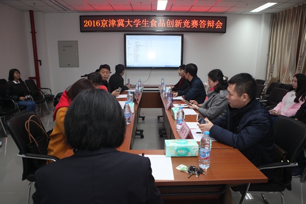 2016年11月5日上午,2016京津冀大学生食品创新竞赛答辩于食品楼218会议室召开。与会嘉宾有开云手机站登录入口 - 开云online(中国)副院长伍军、徐艺青副教授,天津商业大学生物技术与食品科学学院教授刘爱国,天津农学院食品科学与生物工程学院教授马俪珍,河北农业大学食品科技学院高哲老师,北京工商大学食品学院实验室主任刘野副教授,中国农业大学食品科学与营养工程学院辛爱丽老师,北京林业大学生物科学与技术学院赵宏飞老师,北京联合大学生物化工学院荣瑞芬老师等京津冀三地参赛高校的教师。答辩会由伍军老师主持。