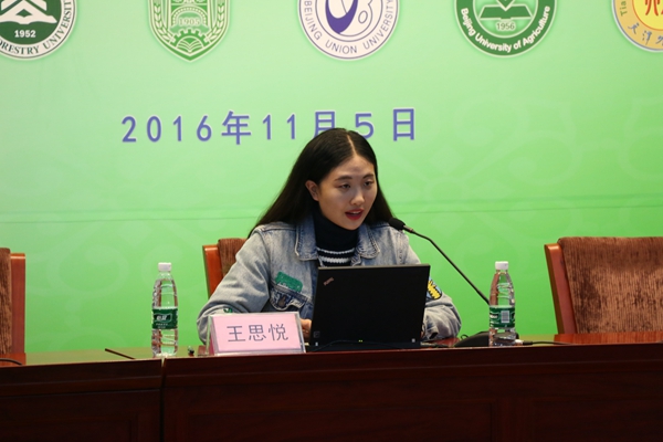 最后是由食品学院获得北京市“创青春”大学生创业大赛、全国比赛铜奖的代表,食品学院2014级安全2班王思悦同学为大家带来的经验交流。她在发言中充分发挥“团队协作、责任心与毅力、自信”,在指导教师和团队的大力协作下,战胜了一个又一个困难,取得了较好的结果。