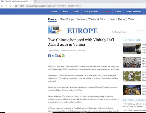为期四天的Vinitaly 2019意大利国际葡萄酒烈酒展于4月7日开展,开展当日,Vinitaly官方公布了系列奖项。我院李德美副教授获最高奖项Vinitaly 2019大奖,获得此奖项的还我国葡萄酒讲师梁扬、意大利酒庄Ornellaia。