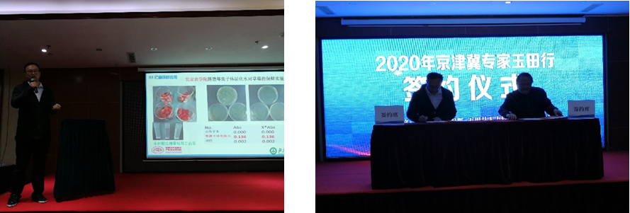 在校办产业处李志敏副处长的组织和协调下,开云手机站登录入口孙运金副教授应邀参加了2020年“京津冀专家玉田行”活动。在唐山市人才交流中心和玉田县组织部的精心组织和筹划,项目路演活动于2020年10月16日在玉田晶玉宾馆顺利进行,孙运金副教授做了题目为“大气等离子体技术在储藏保鲜中的应用”报告,就等离子技术来源和发展做了详细介绍,针对等离子体技术在农业中的杀菌和保鲜进行了专题报道。现场引发参与企业的热烈提问,对是否能够落地玉田进行了探讨。特别是唐山市盛川农产品股份有限公司,与孙运金副教授对等离子体技术的具体实施模式以及应用实践情况进行了深入探讨,初步打算以农产品保鲜、速冻、深加工为名进行了项目立项,并在现场进行洽谈和签约,为项目的后期合作做好铺垫。
