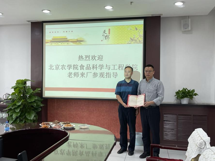 交流会上,总经理刘刚介绍,北京天福号食品有限公司是一家具有270余年历史的“中华老字号”企业,始创于清乾隆三年,凭借“诚信协和,有德乃昌”的经营理念,从最初的熟肉食品加工,发展成为农业生态种植养殖、食品领域、冷链物流等多元化产品和服务典范企业。他说道:天福号与高等院校的合作将会是一项常态化,持续性的工作。校企联合将为老字号吸引更多的年轻人才,改变年轻人对工厂的认知。未来5-10年,年轻人将成为市场的核心消费人群。同时,天福号将致力于同科研院校强强联手,加快科研成果转化,积极探索人才与产业深度融合模式,加速老字号焕发出年轻新活力。