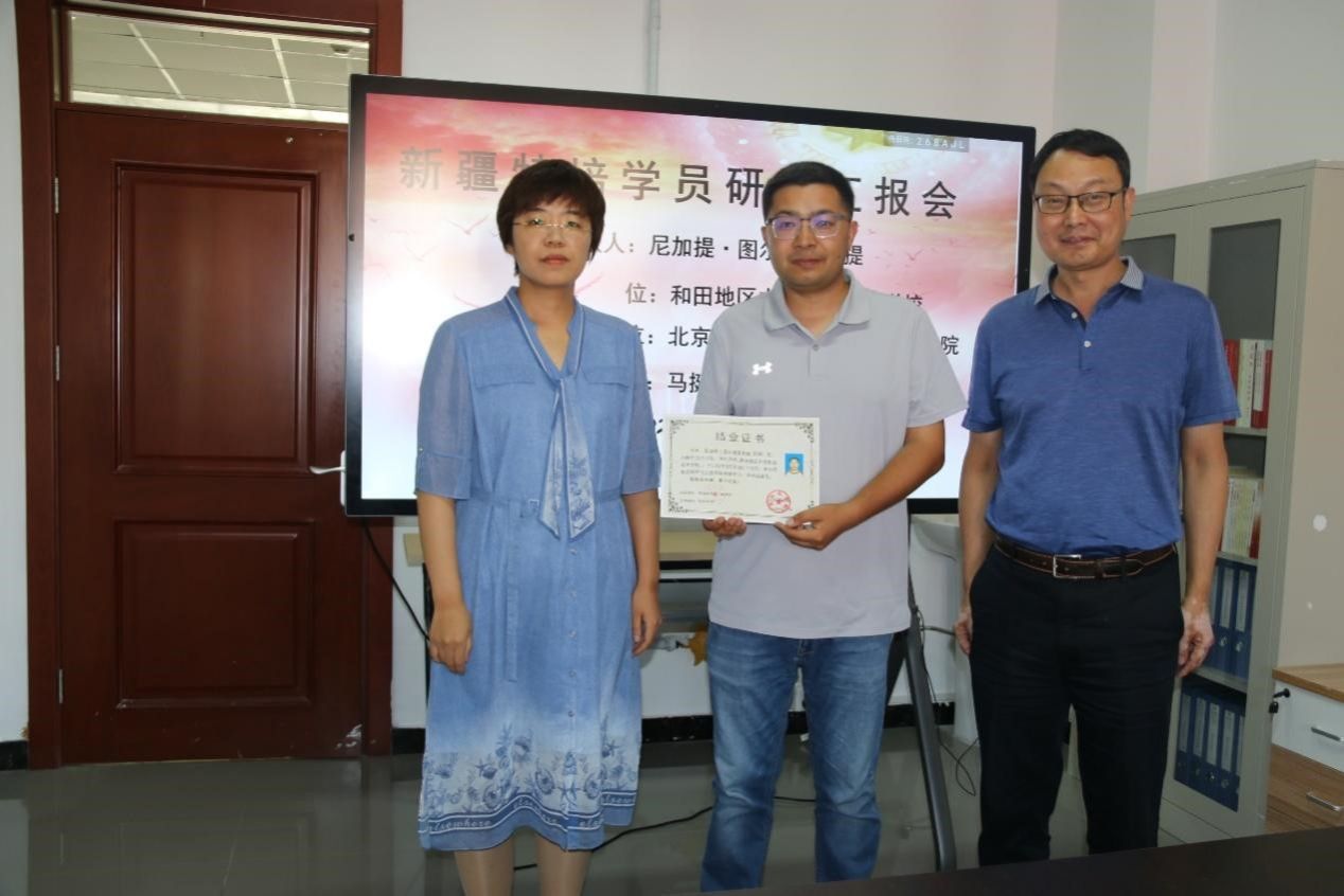 靳晓熙和马挺军向尼加提·图尔迪麦麦提颁发结业证书。与会老师们祝贺尼加提·图尔迪麦麦提顺利完成研修任务。