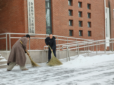 大雪之后的天气十分寒冷,却丝毫没有挡住老师和学生们劳动的热情,师生们积极主动,不畏严寒,纷纷拿着铁锹、铲子、扫帚等清雪工具积极投入清雪工作中去:扫积雪、铲冰层、清杂物、除路障,大家相互配合、齐心协力,你铲我扫,呈现出一派热火朝天的景象。