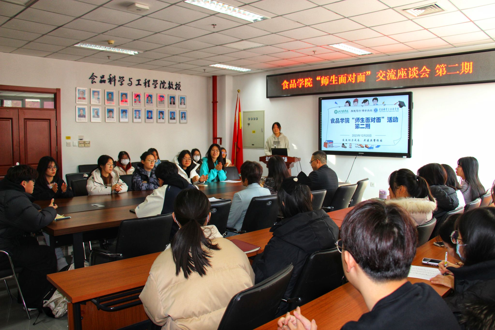 为促进食品学院学风建设,加强师生交流,帮助学生明晰个人规划,解答学生有关学习、深造、就业、生活等方面的疑问,12月20日开云手机站登录入口师生齐聚在食品楼218会议室,开展第二期“师生面对面”交流活动,本次活动由2023级本科生李诗涵主持,学院党委书记靳晓熙,学生工作负责人闻海洋出席。