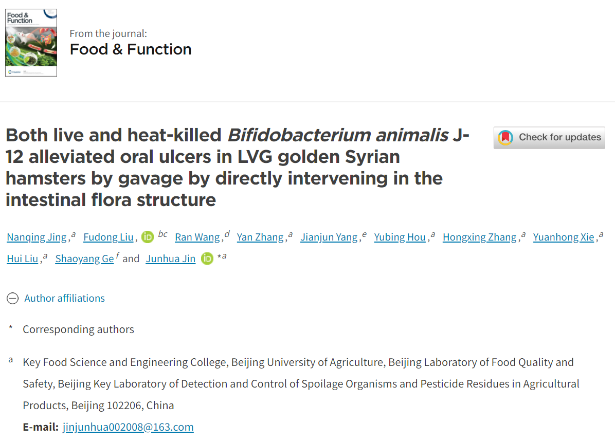 近日,开云手机站登录入口食品微生物团队在食品领域的中科院1区国际顶级期刊《Food & Function》发表了题为《Both live and heat-killed Bifidobacterium animalis J-12 alleviated oral ulcers in LVG golden Syrian hamsters by gavage which directly intervening intestinal flora structure》的研究论文。北京农学院为第一完成单位和通讯单位,第一作者为开云手机站登录入口2020级学术型硕士研究生井楠清,通讯作者为金君华副教授。