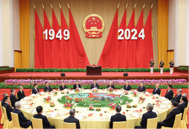 人民大会堂宴会厅华灯璀璨,洋溢着喜庆热烈的节日氛围。主席台上方高悬着庄严的国徽,“1949-2024”大字年号在鲜艳红旗映衬下格外醒目。