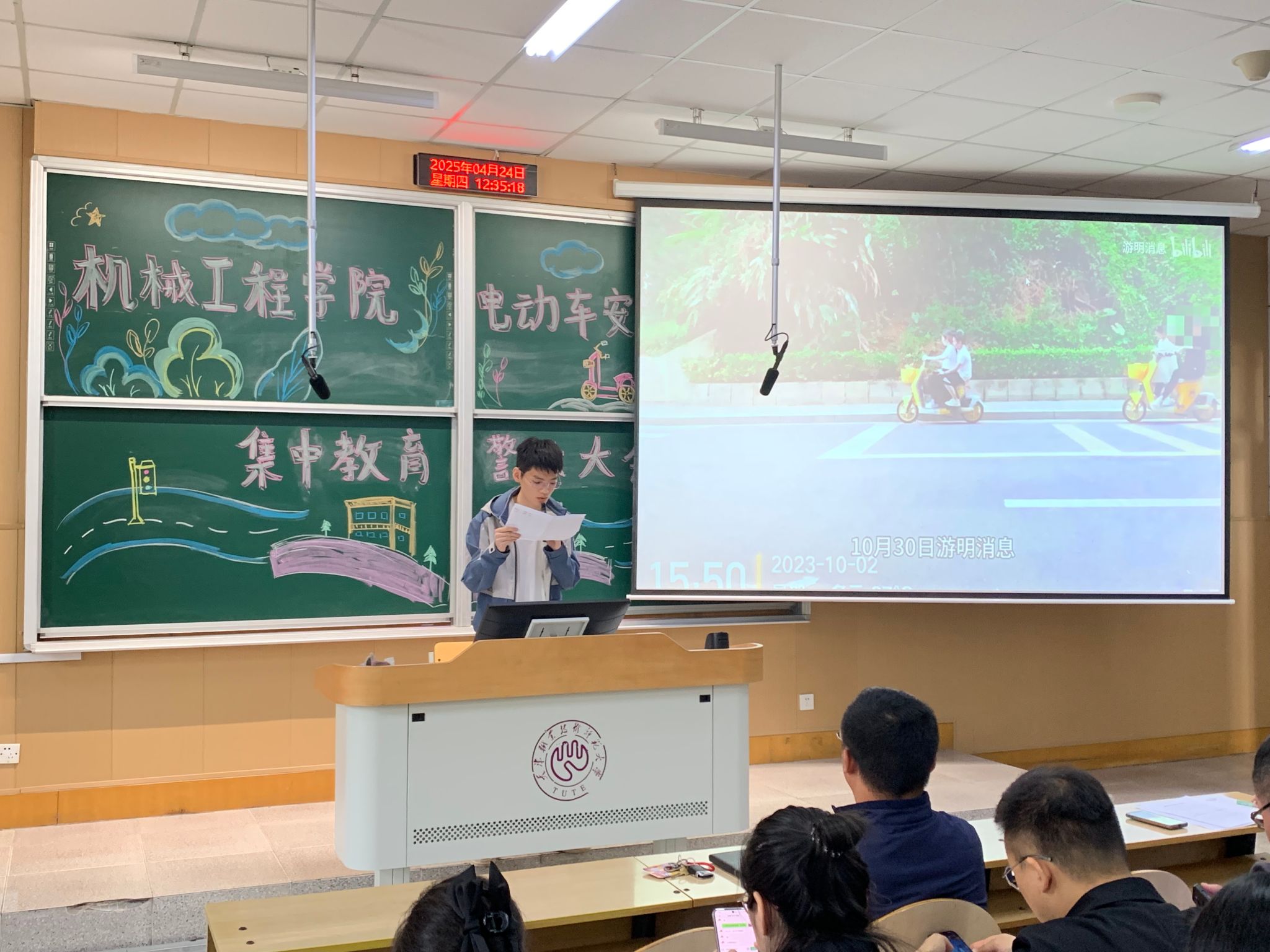 为进一步加强校园电动车安全管理,增强学生安全意识,营造安全有序的校园交通环境。2025年4月24日中午,学院于阶教203召开电动车安全管理集中教育警示大会,党委副书记韩树明,学院团委书记、学工办主任李强,全体辅导员以及各年级保有电动车的学生共同参与此次会议,会议由李强主持。