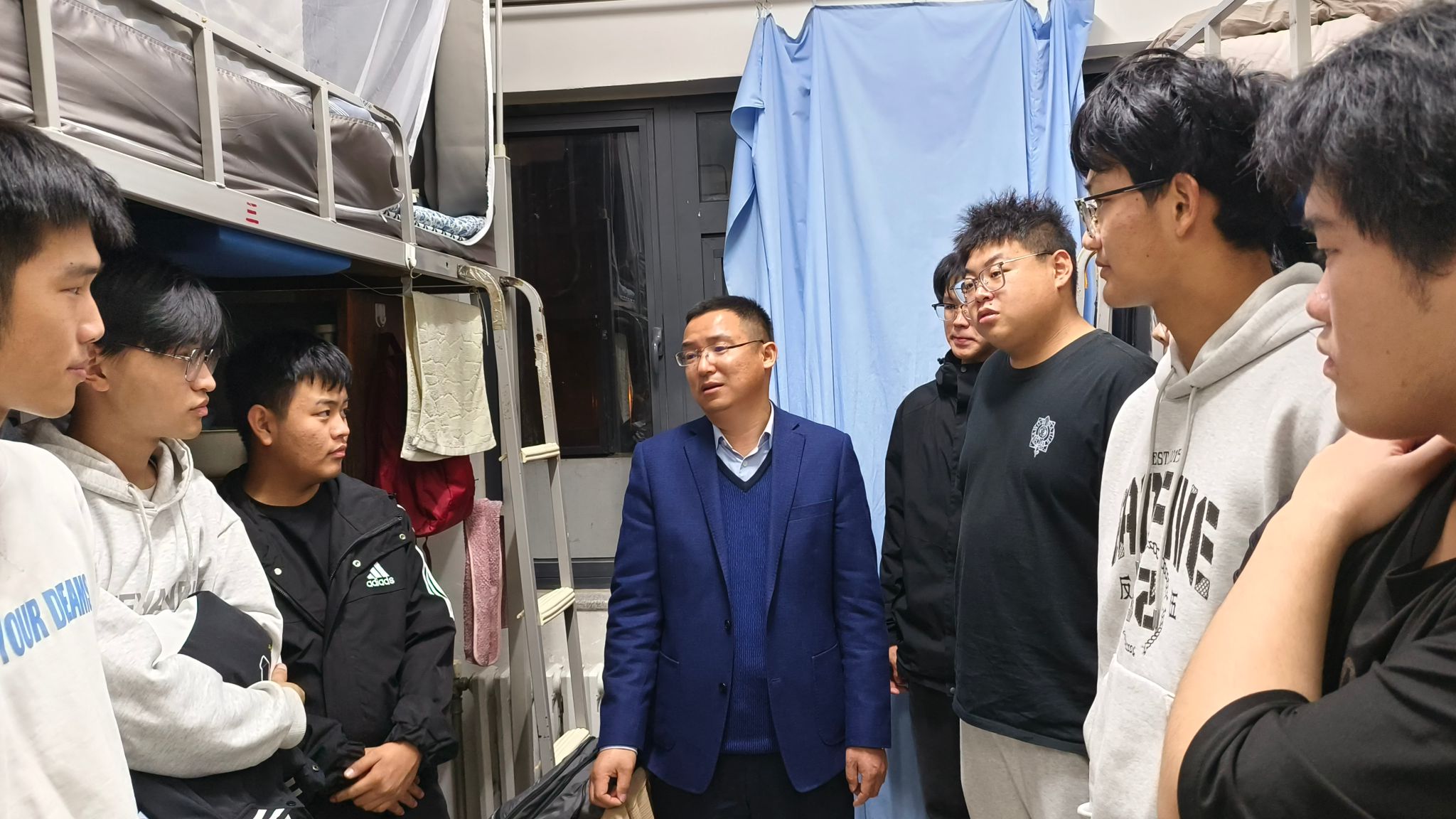 会后,韩树明和辅导员老师带领辅导员助理们迅速行动起来,深入到学生宿舍逐一进行安全排查。了解学生学习生活情况,重点排查学生宿舍违规电器、违禁物品、安全隐患和环境卫生等问题,在检查过程中,耐心地向同学们集中宣讲消防安全的重要性,提醒同学们要加强宿舍学风建设,遵守宿舍管理规定,注意防火、防盗,做好宿舍卫生和个人卫生,增强自我保护意识。