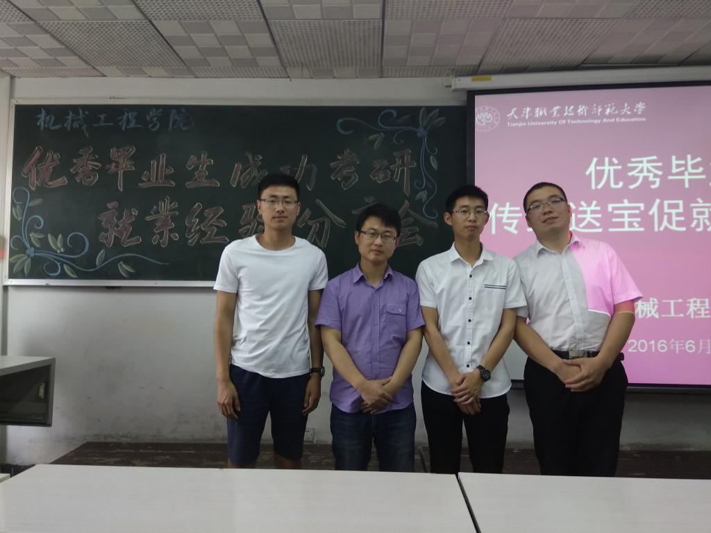 本次活动由3名优秀毕业生分别就个人考研和求职经历进行了经验分享。机自1202班程堂灿详细介绍了考研历程,对学弟学妹们提出实用的考研建议,希望大家在考研之前明确自己的目标,坚持到底,取得最后的胜利。来自机师1111班成功求职职教教师的舒明同学为准毕业生们提供了宝贵的求职经验,就如何成为一名优秀的职教教师提出自己的意见。名企就业的材料1111班郑龙峥结合自身求职经历,就大学生在校期间如何发挥个人主动性,不断取得成长进步提出了个人观点,鼓励大家在校期间争取个人最大程度的提升锻炼。辅导员王海在总结中,勉励在校学生以优秀毕业生为榜样,做好在校期间的学习和工作计划,为如何成为一名优秀的毕业生做足准备。