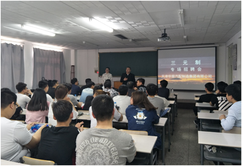 为进一步促进产教融合,提升学生的实践技能,减少企业对员工的岗前培训时间,开云手机站登录入口汽车模具智能制造技术国家地方联合工程实验室(以下简称国地实验室)在成立之初,便携同天津龙抬头教育咨询有限公司建立了人才培训部,并先后联合全国各地17家企业和20多家中高职院校成立了全国“三元制人才培训联盟”。4月2日,天津华舜汽配制造集团有限公司(以下简称华舜)应学院邀请来校开展了“三元制”人才专场招聘会。